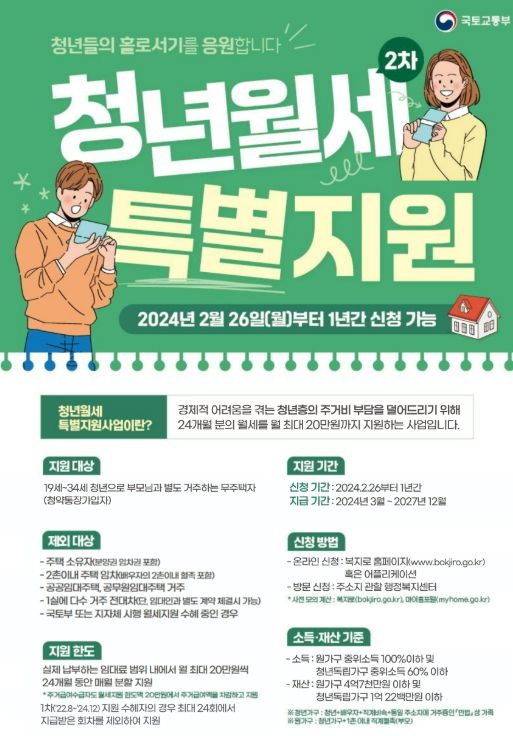 신청 기간은 2025년 2월 25일까지이며, 지급 기간은 2027년 12월까지로 월 최대 20만 원씩 24개월분의 월세를 지원한다.