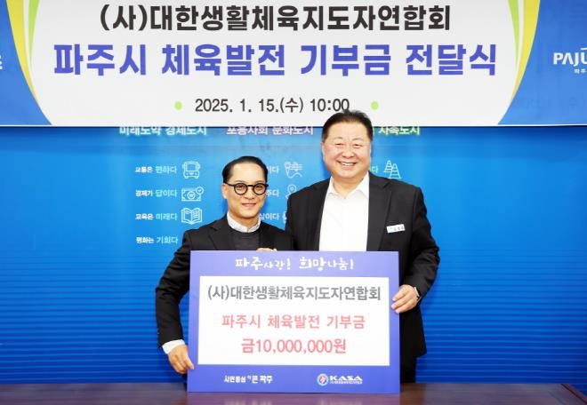 [경남도민뉴스=김미순 기자] 파주시는 지난 15일 금촌다목적실내체육관 위탁운영사인 (사)대한생활체육지도자연합회로부터 체육 발전과 나눔 실천을 위해 1천만 원을 기탁 받았다고 밝혔다.