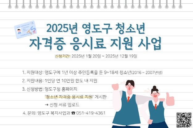 해당 사업은 영도구에 1년 이상 주민등록을 둔 9세~18세(2007년생~2016년생) 청소년이 대상이며, 2025년 실시하는 자격증 시험에 대해 1월 20일부터 12월 19일까지 영도구청 홈페이지를 통해 신청할 수 있다.