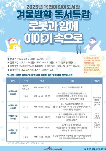 이번 행사는 국립어린이청소년도서관 ‘2025년 전국 도서관 겨울 독서교실’ 지원사업으로 독서교실 운영물품(독서노트, 스티커, 배지 등)을 지원받아 진행되며, 우수 참여자에게는 국립어린이청소년도서관장상도 수여한다.