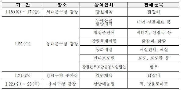 참여하는 직거래 장터는 1월 16일~17일 서대문구청 광장(강원계육), 1월 21일 강남구청 주차장(강원계육), 1월 22일 동대문구청 광장(두메산골 한방더덕·청정춘천애·강원육계식품·동화매실·만나포도원·강원한우조합공동사업법인), 1월 22일~23일 송파구청 광장(삼남매농원)이다.