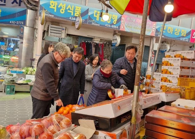 직원들은 설맞이 특별할인판매 행사가 진행 중인 김천사랑상품권과 온누리상품권을 이용해 농축산물, 제사용품 등을 구매했으며, 특히 청년 상인들의 어려움을 공감하고 격려하기 위해 청년마켓 ‘포도락’에서 점심 식사를 함께 했다.