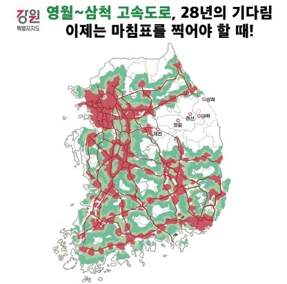한편, 현재 강원 지역 30분 내 고속도로 접근 가능 면적 비율은 40.8%로 전국 최하위 수준이며, 특히 도내 폐광 지역과 접경 지역은 고속도로 30분 내 진입이 불가능한 상황이다.