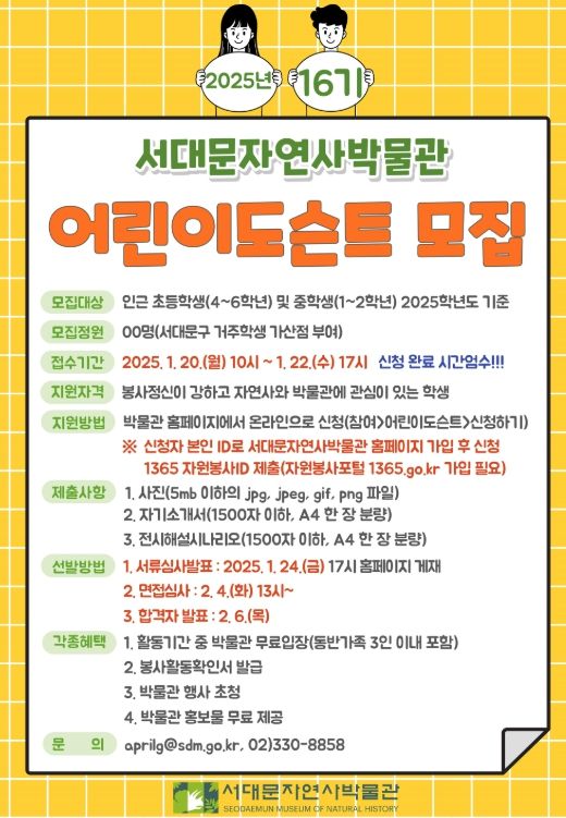 이달 22일 오후 5시까지 서대문자연사박물관 홈페이지를 통해 어린이도슨트 지원 희망자를 모집하며 최종 합격자 발표는 2월 6일로 예정돼 있다. 자세한 내용은 박물관 홈페이지 공지사항을 참고하면 된다.