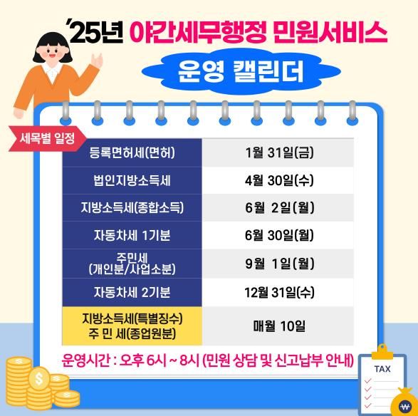 야간 세무행정 민원서비스를 운영하는 날은 등록면허세, 법인지방소득세, 지방소득세, 자동차세, 주민세 등 세금 납부기한 마감일과 지방소득세 특별징수분, 주민세 종업원분을 납부하는 매달 10일이다. 납부기한 마지막 날 근무시간 종료 후 18시부터 20시까지 2시간씩 연장 운영될 예정이므로, 필요한 경우에는 구청 지방소득세과를 직접 방문하거나 유선(02-3396-5226)으로 문의하면 된다.