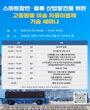 세미나는 고중량물 이송 자율이동체(AMR) 시험평가센터 기반구축사업 및 기업지원사업 소개를 시작으로 △스마트항만 소개 및 무인이송장비의 운영현황 △ 항만 AGV 구축사례 및 개발방향 △자율주행로봇 기술세미나 3가지 주제로 진행된다.