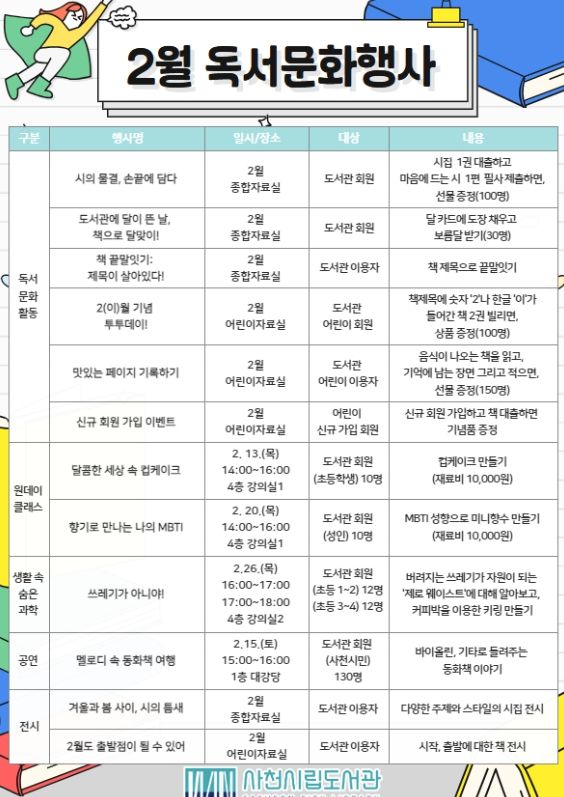 사천시립도서관 관계자는 “이번 2월 한 달 동안 진행되는 독서문화행사를 통해 주민들이 즐겁고 의미 있는 시간을 보낼 수 있을 것”이라고 말했다.