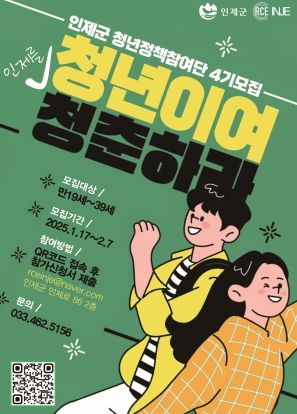인제군은 청년의 군정 참여 기회를 확대하고 소통을 강화하기 위해 청년정책참여단을 모집한다고 밝혔다.
