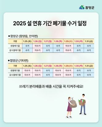 쓰레기 수거 일정은 △25일 함양읍, 안의면 △27일은 전 읍면 △28일은 함양읍, 안의면에서 수거하고 △30일은 전 읍면에서 정상 수거한다.
