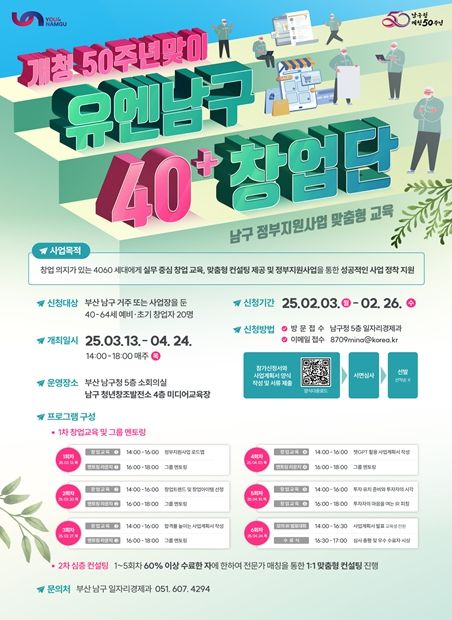 [경남도민뉴스=김채연 기자] 부산 남구는 개청 50주년을 맞아 중장년 예비·초기 창업자를 위한 신규사업인 '유엔남구 40+ 창업단'을 본격적으로 추진한다.