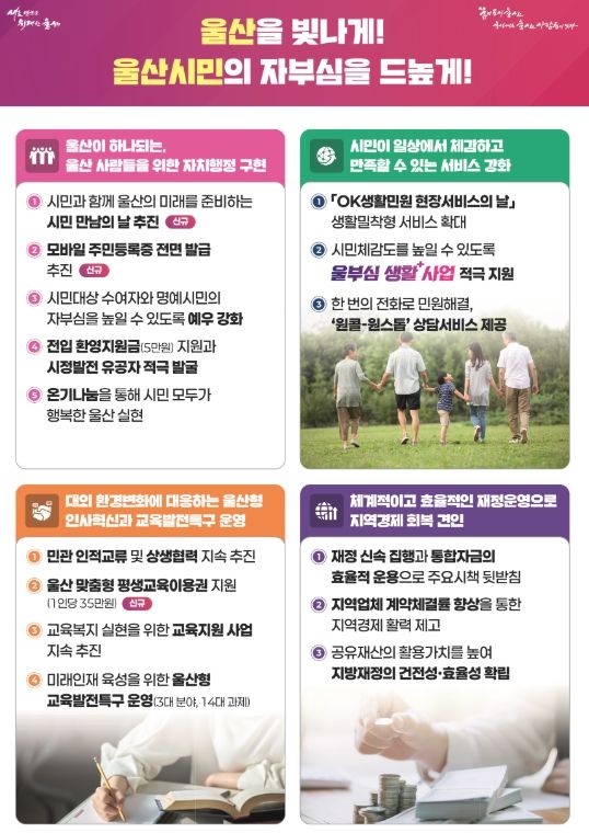 이를 위해 ▲울산 사람들을 위한 자치행정 구현 ▲시민 체감형 서비스 강화 ▲울산형 인사혁신 및 교육발전특구 운영 ▲효율적인 재정운영을 통한 지역경제 회복 등 4대 전략을 제시했다.
