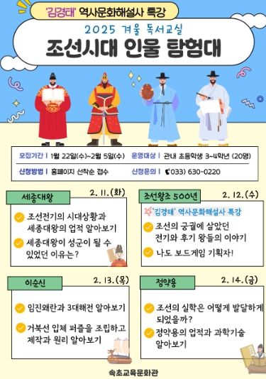 [경남도민뉴스=표재민 기자] 속초교육문화관은 겨울 방학을 맞이하여 관내 초등학교 3~4학년 20명을 대상으로 ‘조선시대 인물 탐험대’를 주제로 한 겨울 독서교실을 운영한다.