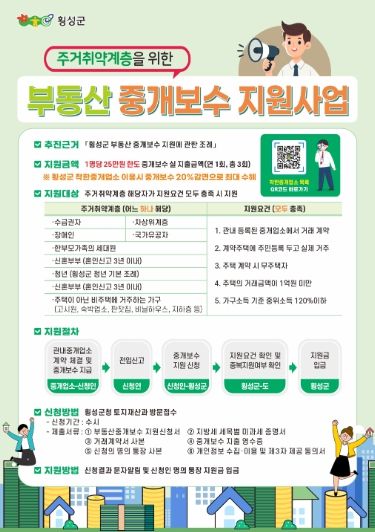 [경남도민뉴스=표재민 기자] 횡성군이 신혼부부, 청년, 장애인 등 주거취약계층 부동산 중개보수를 최대 25만원 지원하는 사업을 본격 시행한다.