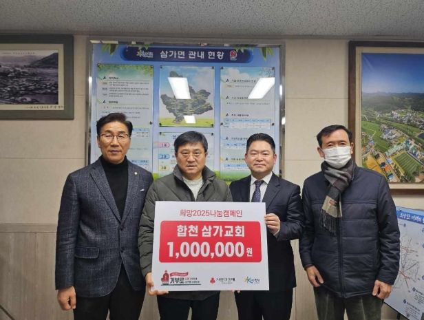 서문병관 삼가면장은 “매년 꾸준히 나눔을 실천해 주시는 한동근 목사님과 교회 관계자분들께 깊이 감사드린다”며 “기탁해 주신 성금은 도움이 필요한 이웃들에게 소중히 전달하겠다”고 전했다.