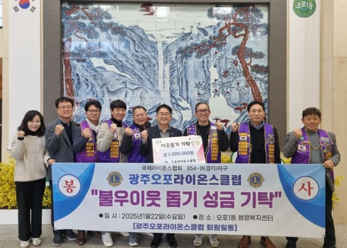 [경남도민뉴스=김미순 기자] 광주오포라이온스클럽은 22일 관내 어려운 이웃을 위해 사용해 달라며 오포1동에 성금 100만 원을 전달했다.