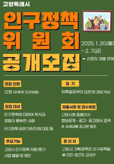 [경남도민뉴스=김미순 기자] 고양특례시는 제4기 인구정책위원회 위원 공개모집을 실시한다고 22일 밝혔다.