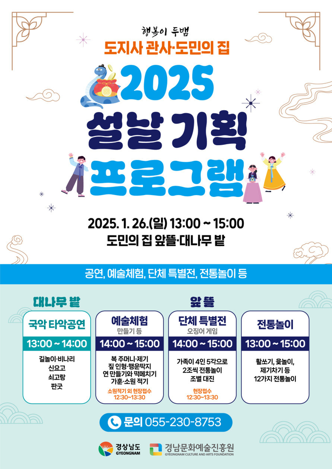 조여문 경남도 문화예술과장은 “설 명절을 맞아 가족들과 함께 전통문화를 체험하며 즐거운 시간을 보내시길 바란다”라며, “이번 행사를 통해 따뜻한 명절을 만드는 데 도움이 되기를 기대한다”라고 말했다.