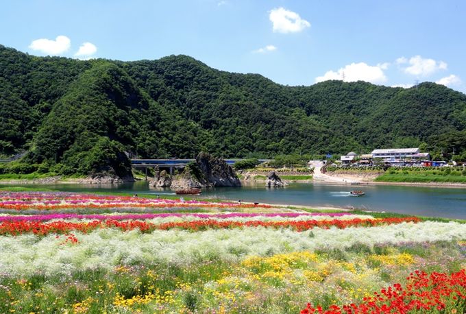 건너편에 자리한 도담정원은 도담리 수변 유휴부지에 계절 초화류 심어 조성된 새로운 경관형 관광지로 큰 인기를 끌고 있다.