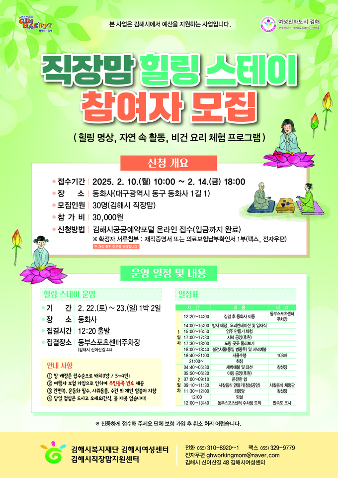 모집 대상은 김해시에 거주하거나 근무하는 직장 여성(직장맘)이며, 총 30명을 선착순으로 모집한다. 참가비는 30,000원이며, 숙박 및 식사가 제공된다.