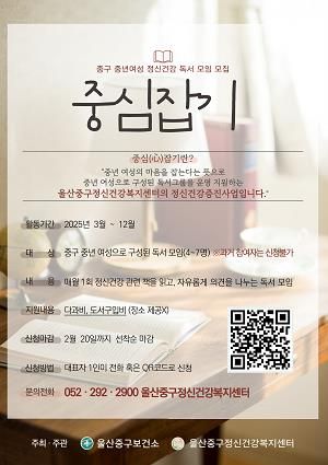 [경남도민뉴스=최재경 기자] 울산 중구정신건강복지센터가 독서모임 ‘중심잡기’ 사업에 참여할 단체를 모집한다.