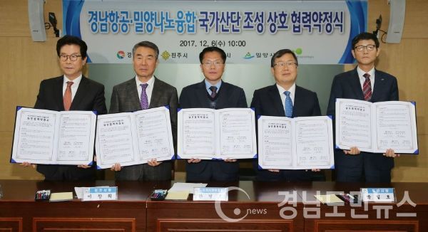 (경남도/이형섭 기자) = 경남도와 진주시, 사천시, 밀양시, 한국토지주택공사는 6일 오전 10시 도정회의실에서 경남미래 주력사업으로 추진 중인 경남항공·밀양나노융합 국가산업단지 성공적 조성을 위한 상호 협력약정식을 가졌다.