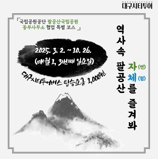 [경남도민뉴스=백형찬 기자] 대구광역시는 팔공산국립공원동부사무소와 협업해 3월부터 10월까지 매월 1, 3, 4번째 일요일에 1천 원으로 팔공산을 즐길 수 있는 대구시티투어 특별노선을 운영한다.