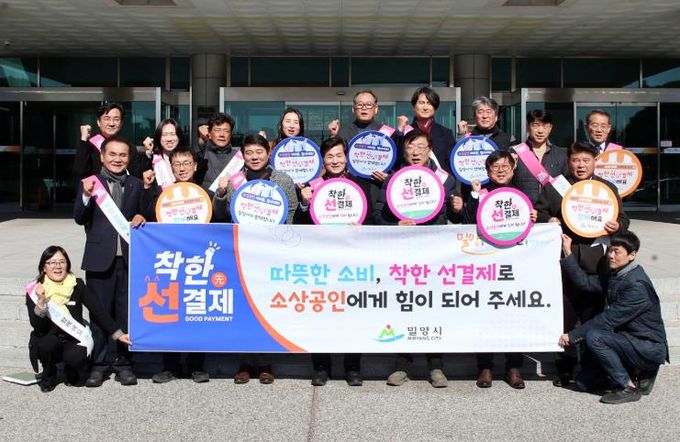 [경남도민뉴스=나희준 기자] 밀양시는 19일 농협중앙회 밀양시지부, 밀양시산림조합 등 관내 기관 · 단체장 20여 명이 참여한 가운데‘밀양형 착한 선(先)결제’홍보 캠페인을 펼쳤다.