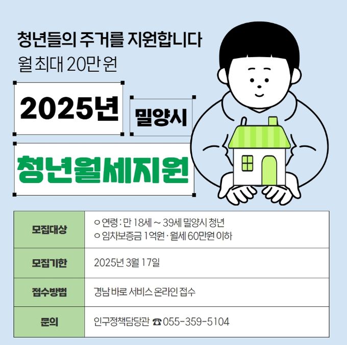 [경남도민뉴스=나희준 기자] 밀양시는 청년층의 주거비 부담 절감을 위한 2025년 청년 월세 지원사업 신청을 오는 3월 17일까지 받는다.