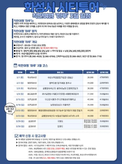 한편, 화성시 시티투어 3월 프로그램은 신규 참가자는 20일 오후 5시부터, 그 외 참가자는 21일 오후 5시부터 예약할 수 있다.