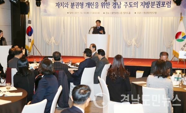 (경남도/이형섭 기자) = 경남도와 경남발전연구원은 ‘연방제 수준의 분권국가’를 대비하고 경남이 선도하는 자치분권 실현을 위해 12일 오전 풀만호텔에서 조찬 포럼을 개최했다.