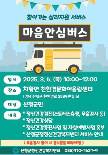 [경남도민뉴스=김태수 기자] 산청군은 오는 3월 6일 차황면 친환경문화어울림센터에서 찾아가는 심리지원 서비스 마음안심버스를 운영한다고 28일 밝혔다.