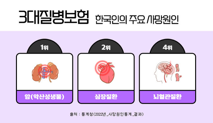 [경남도민뉴스=백형찬 기자] 한국인의 주요 사망원인중에 암, 뇌혈관질환, 심혈관질환은 흔히 3대질병이라 일컬어지며 살아가면서 가장 먼저 대비해야 하는 중대질병으로 항상 강조되고 있다. 이들 질병에 미리 대비하기 위해 가입하는 것이 진단비보험인데, 이러한 3대질병진단비를 중점으로 보장하는 보장성보험이 3대진단비보험 이다. 3대질병진단비보험은 각각의 질병에 주목해서 보장하기도 하지만, 나에게 맞는 추가 특약을 잘 골라서 가입한다면 종합건강보험으로도 충분히 활용도가 높다.
