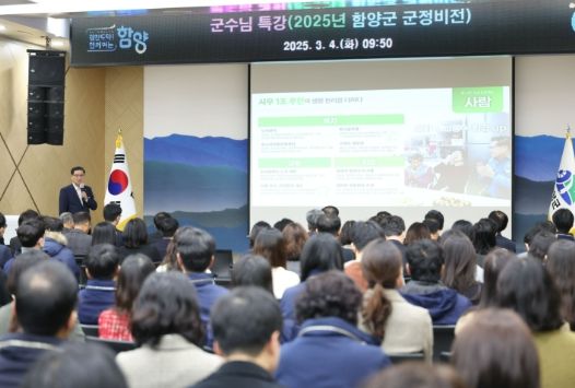 특강 순서에서는 진병영 군수가 직접 ‘2025년 함양군 군정 비전’을 직원들에게 설명하며 지난해 성과 및 반성, 올해 군정방향 등을 공유하는 시간을 가졌다.