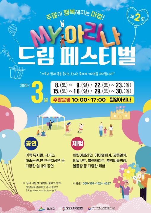 [경남도민뉴스=나희준 기자] 경남 밀양시는 오는 8일부터 30일까지 밀양아리나에서 온 가족이 함께 공연과 체험을 즐길 수 있는 제2회 MY아리나 드림 페스티벌을 개최한다고 밝혔다.