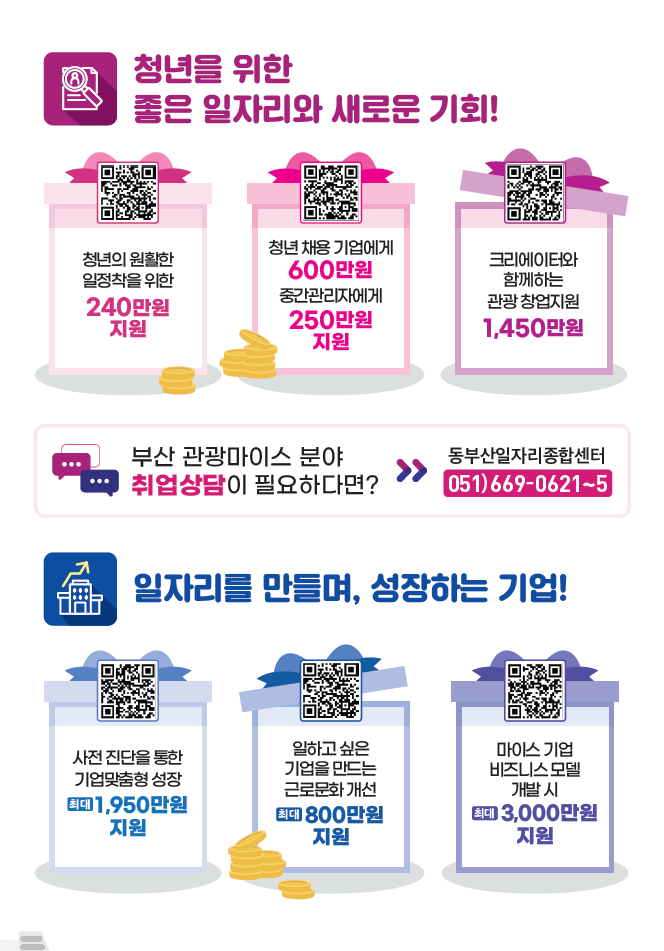 부산시는 청년 인력 유입과 근속 촉진을 위해 장려금을 지급하고, 청년 창업 지원을 통해 일자리 기회를 확대한다. 관광 분야 창업 희망자에게는 창업 교육과 초기 창업 비용을 지원하며, 산업 맞춤형 인력 매칭을 위해 동부산일자리종합센터를 통한 고용서비스를 제공한다. 아울러 소규모 기업의 역량 강화와 근로 환경 개선을 위한 비용 지원, 마이스 우수기업 육성을 위한 비즈니스 모델 개발 지원 등을 통해 산업 체질 개선에 나선다.