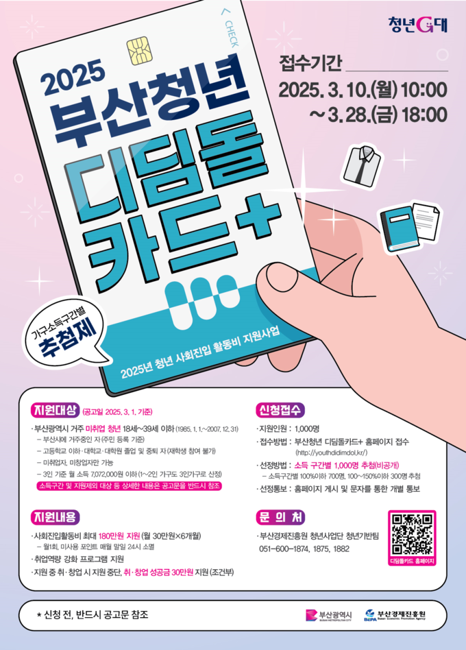 [경남도민뉴스=신석주 기자] 부산시가 올해 '청년 사회진입 활동비 지원(청년 디딤돌 카드+)' 사업에 참여할 청년 1천 명을 모집한다고 발표했다. 이 사업은 부산시에 거주하는 기준중위소득 150% 이하인 18세부터 39세 사이의 미취업 청년들에게 월 30만 원씩 6개월 동안 '청년디딤돌 카드+' 포인트를 제공하여 구직활동을 지원하는 프로그램이다.