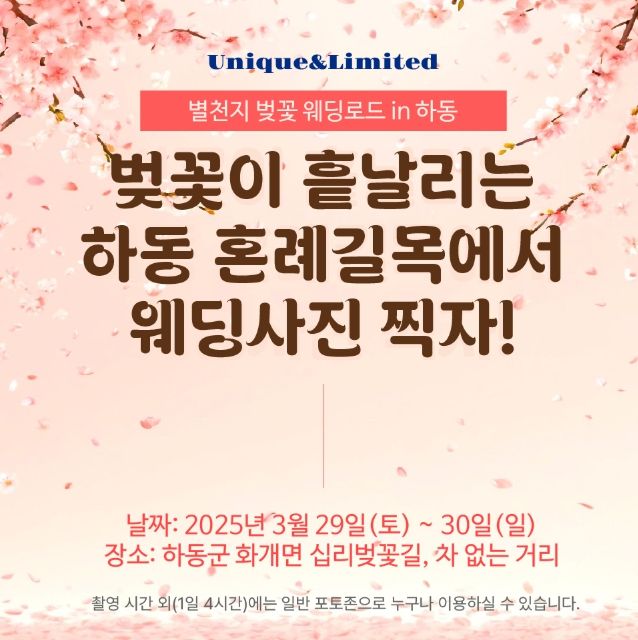 이번 행사는 3월 29일과 30일 양일간 십리벚꽃길 차없는거리에서 진행되며, 벚꽃 아래에서 로맨틱한 순간을 기록하고 싶은 커플들에게 잊지 못할 추억을 선사할 예정이다.