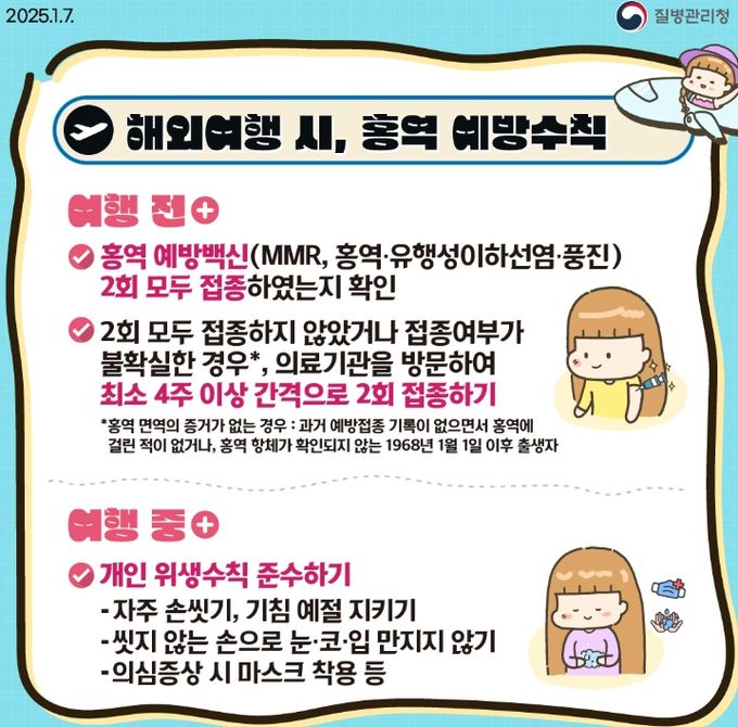 특히 면역체계가 취약한 1세 미만 영유아는 유행국가 방문을 최대한 자제하고, 방문이 불가피하다면 반드시 출국 전 홍역 가속 예방접종을 받을 것(출국 최소 2주 전 1회)을 강조했다.