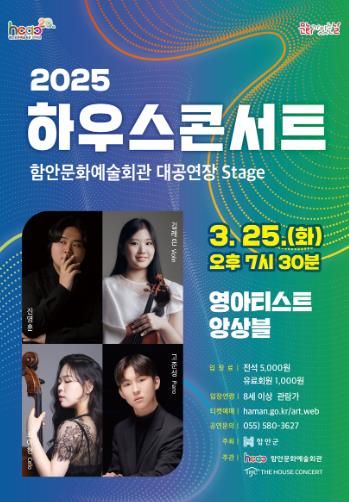 [경남도민뉴스=권중환 기자] 함안문화예술회관은 3월 문화가 있는 날을 맞아 오는 25일 오후 7시 30분 함안문화예술회관 대공연장에서 하우스콘서트 공연으로 ‘영아티스트 앙상블’의 무대를 선보인다.