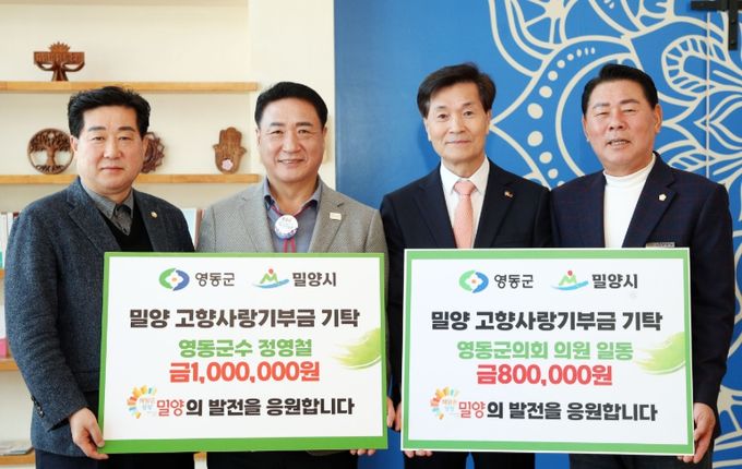 [경남도민뉴스=나희준 기자] 밀양시는 12일 선샤인밀양테마파크에서 정영철 영동군수와 신현광 의장을 포함한 8명의 의원으로 구성된 영동군의회가 밀양시 고향사랑기부금을 각 100만원, 80만원을 기탁했다고 밝혔다.