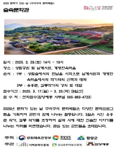 3월의 주제는 ‘숲속문학관’으로, 오는 29일 토요일 오후 2시부터 7시까지 유홍준, 김륭 작가와 함께 함양 상림, 남계서원, 개평한옥마을을 여행하며 작가의 시와 삶에 대한 진솔한 이야기를 나누는 시간을 마련할 예정이다.