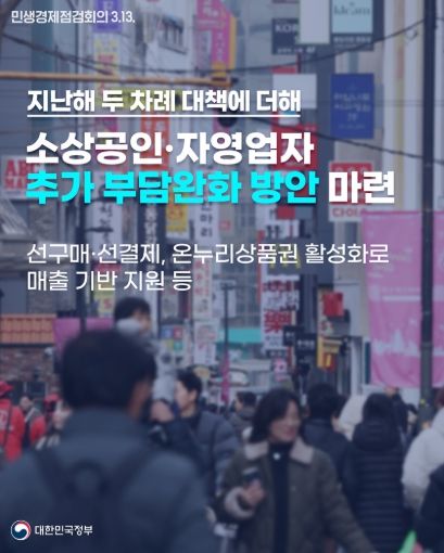 공공 주도-민간으로 확산하는 '착한 선구매·선결제' 캠페인과 온누리상품권 활성화 등으로 소상공인 매출이 늘도록 지원하겠다는 내용입니다.