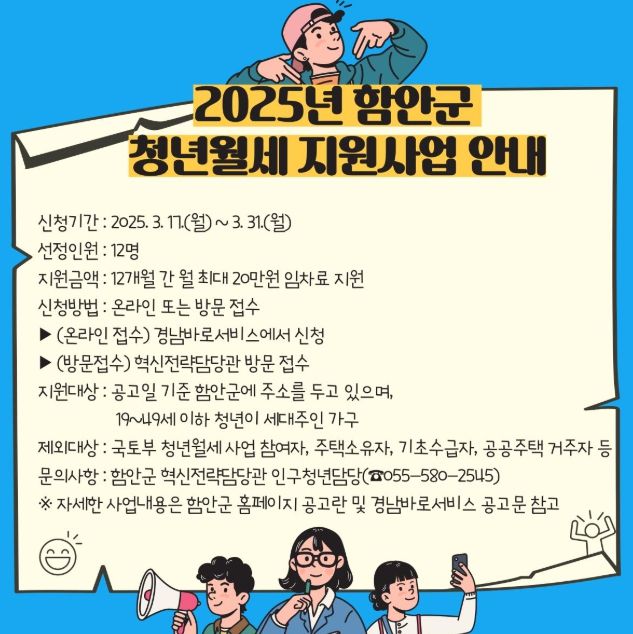 함안군 청년 월세 지원사업은 부모와 별도 거주하며 함안군에 주소를 둔 만 19세~49세 이하의 무주택 청년이 세대주며 임차보증금 1억 원 이하, 월세 60만 원 이하의 주택에 거주하는 청년으로, 중위소득 60%~150%이하인 경우 신청할 수 있다.