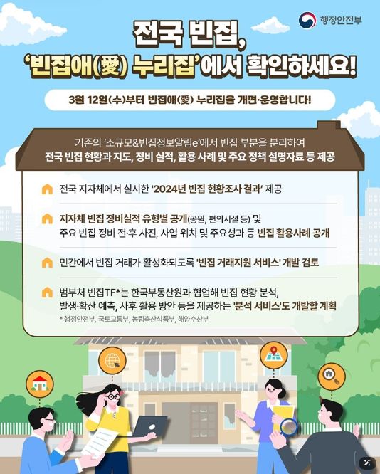 [경남도민뉴스=백형찬 기자] 전국 빈집 현황을 쉽게 확인하고 활용 방안을 공유할 수 있도록 3월 12일(수)부터 빈집애(愛) 누리집을 개편·운영합니다!