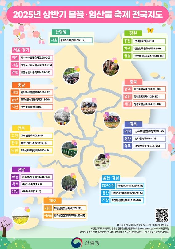 산림청은 전국의 산림과 관련된 축제를 한눈에 볼 수 있는 2025년 상반기 '봄꽃·임산물 축제 전국지도'를 발간했습니다.