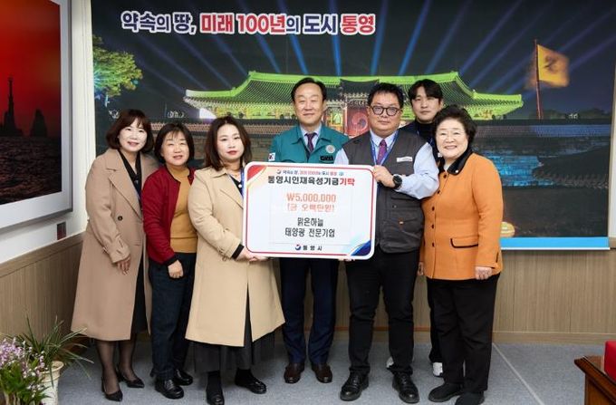 [경남도민뉴스=김부경 기자] 맑은하늘 태양광 전문기업은 지난 14일 통영시를 찾아 인재육성기금 500만 원을 기탁했다.