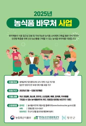 [경남도민뉴스=권중환 기자] 함안군은 취약계층의 식품 접근성 강화 및 농식품 소비체계 구축을 통한 국민 먹거리 안전망 확충을 위해 실시하는 2025년 농식품 바우처 사업의 신청을 오는 12월 12까지 상시 접수받는다고 밝혔다.