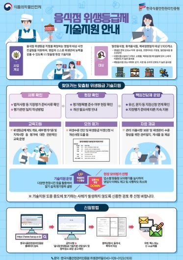 음식점 위생등급제 기술지원 사업은 평가기준 및 주요 지적사항 안내 등 영업자의 이해를 돕고 위생등급제를 보다 쉽게 준비할 수 있도록 전반적인 교육과 현장 방문을 통한 1:1 맞춤형 컨설팅으로 무상으로 지원한다.