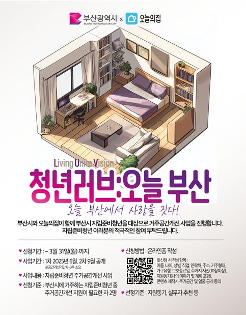 지원을 희망하는 부산 거주 자립준비청년은 오는 3월 31일까지 시 공식 인스타그램과 '오늘의집' 공식 유튜브 채널 커뮤니티에 게시된 온라인 폼 링크를 통해 신청하면 된다.