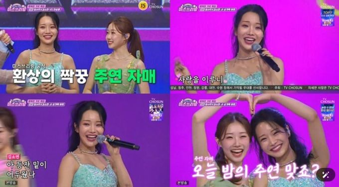 이어진 무대에서 김소연은 "오늘은 '미스쓰리랑' 공식 절친의 우정 무대를 준비했다"며 정서주와 노지훈의 '손가락 하트' 무대를 펼쳤다.